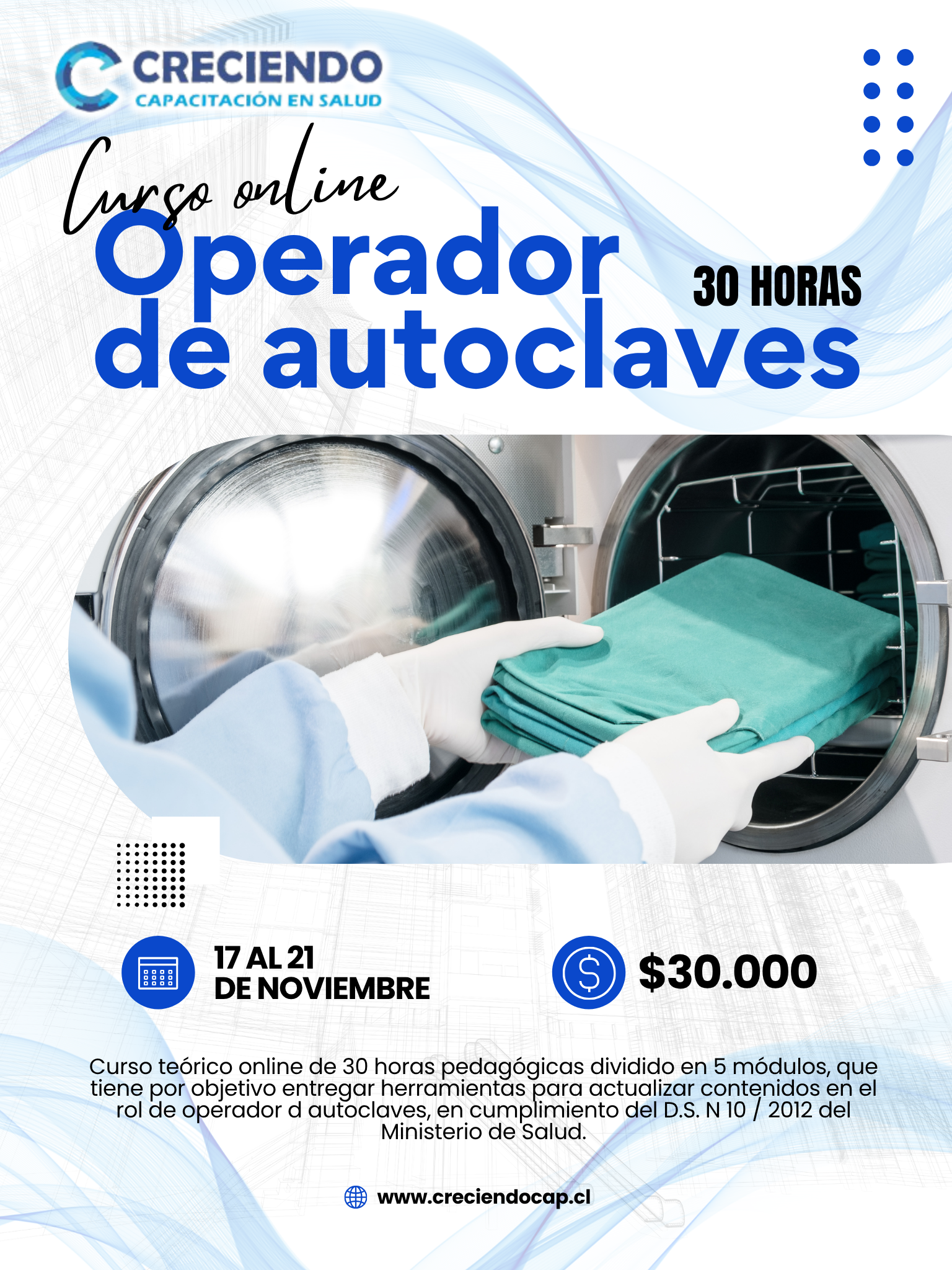 Descripción del Curso: Curso teórico online de 30 horas pedagógicas dividido en 5 módulos, que tiene por objetivo entregar herramientas para actualizar contenidos en el rol de operador de autoclaves, en cumplimiento del D.S. N 10 / 2012 del Ministerio de Salud.